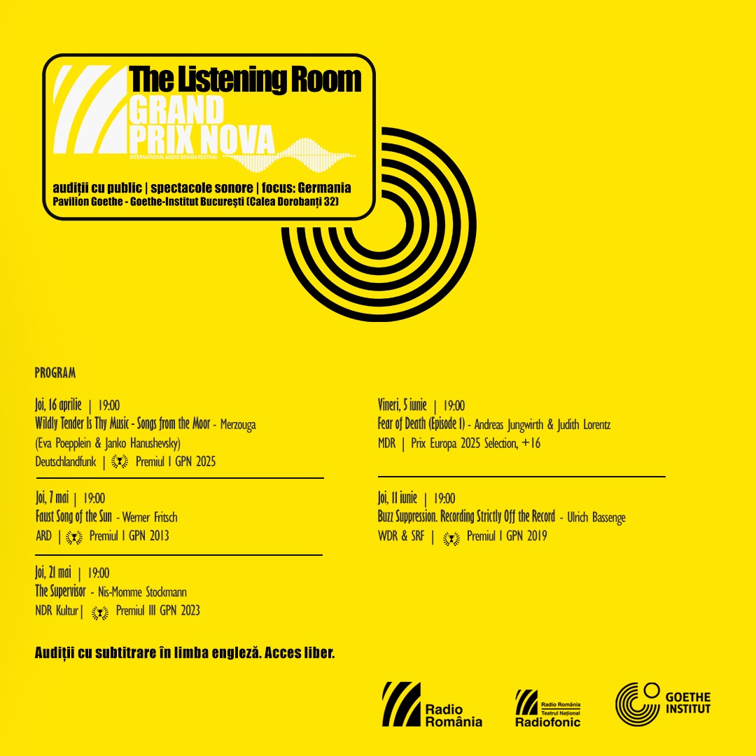 Teatrul Național Radiofonic lansează The Listening Room – o serie de audiții cu public, în prefaţa Festivalului Internațional de Teatru Radiofonic Grand Prix Nova, ajuns la a XIV-a ediție. Audiţiile se vor desfăşura în perioada 16 aprilie – 11 iunie, la Pavilionul Goethe al Goethe-Institut București (Calea Dorobanţi 32), partenerul evenimentului.