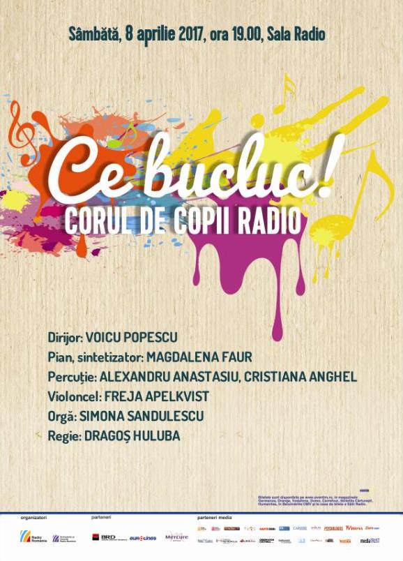 Sâmbătă, 8 aprilie, ora 19:00, scena Sălii Radio devine un spaţiu al jocurilor copilăriei pe ritmuri muzicale, într-un concert-spectacol al Corului de Copii Radio, sub îndrumarea dirijorului Voicu Popescu, în regia lui Dragoş Huluba. Acompaniat la pian de Magdalena Faur, cu participarea lui Alexandru Anastasiu şi a Cristinei Anghel (percuţie), a lui Freja Apelkvist (violoncel) şi a Simonei Săndulescu (orgă), Corul de Copii Radio pregăteşte o călătorie buclucaşă în lumea irezistibilă a jocurilor celor mici de altădată, imaginate muzical de compozitorii Paul Constantinescu (Hora de şoareci, pe versuri de Tudor Arghezi), George Balint (Am o mâţă şi-un motan), Dan Buciu (Jocuri pentru pacea Planetei, fragmente), Sabin Pautza (Ofrandă copiilor lumii, fragmente), Dan Voiculescu (Ce bucluc!, pe versuri de Marin Sorescu).