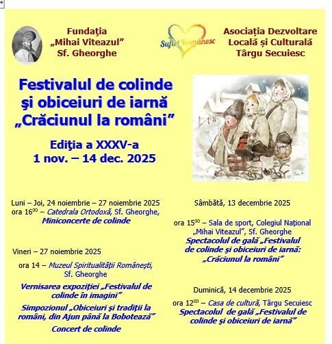 Festivalul internaţional de colinde şi obiceiuri de iarnă ‘Crăciunul la români’, ajuns la cea de-a 25-a ediţie, se va încheia la sfârşitul acestei săptămâni cu două spectacole de gală, ce vor avea loc în municipiile Sfântu Gheorghe şi Târgu Secuiesc, anunţă organizatorii.