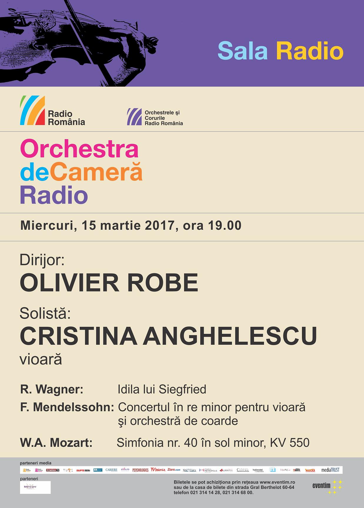 Concert OCR 15mar afisMiercuri, 15 martie, ora 19:00, Orchestra de Cameră Radio prezintă la pupitru un tânăr dirijor în plină ascensiune pe scenele muzicale din Europa: Olivier Robe, alături de cunoscuta violonistă Cristina Anghelescu, solist concertist al Orchestrelor şi Corurilor Radio. Idila lui Siegfried de Wagner este capul de afiş al concertului din 15 martie, urmată de Concertul în re minor pentru vioară şi orchestră de coarde de F. Mendelssohn şi de Simfonia nr. 40 în sol minor de Mozart.