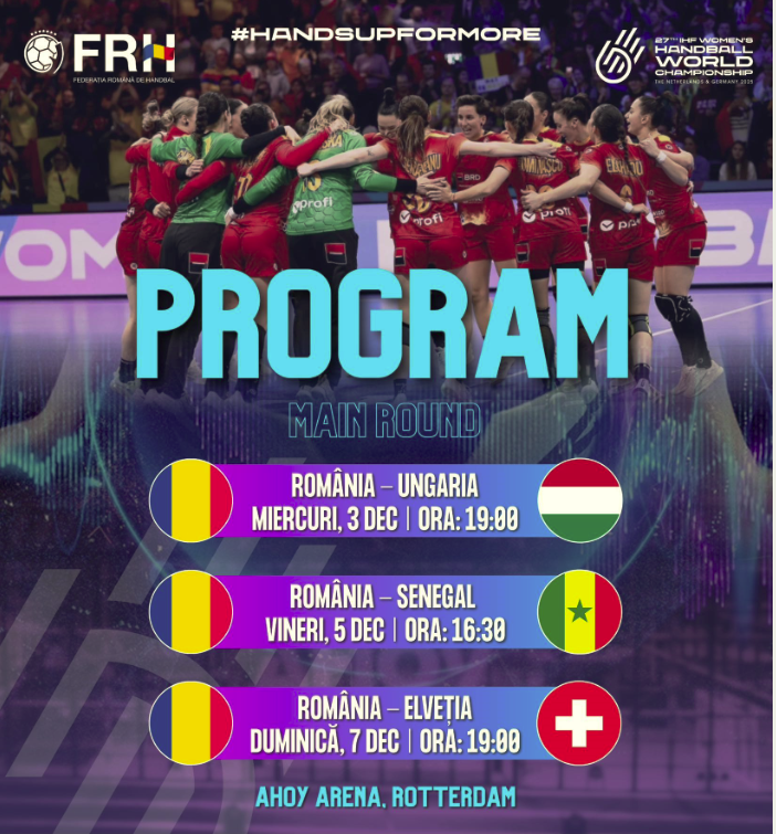 România evoluează în grupa I principală (Main Round), a Campionatului Mondial de handbal feminin, al cărui turneu final este găzduit de Germania și Olanda în perioada 26 noiembrie – 14 decembrie, la Dortmund, Stuttgart și Trier, respectiv la Rotterdam și ‘s-Hertogenbosch.