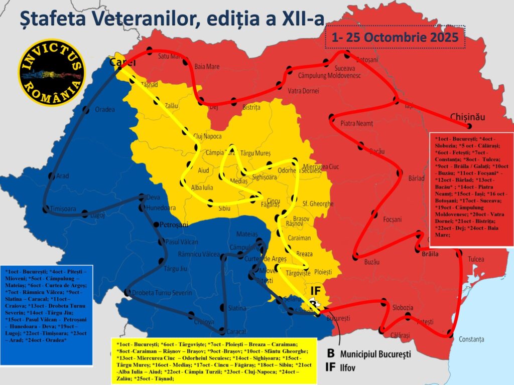 Iniţiată în 2014 de voluntarii Invictus România, Ştafeta Veteranilor a devenit o tradiţie naţională care, an de an, adună sute de voluntari – militari activi şi în rezervă, sportivi, tineri, profesori, familii întregi – în jurul unei misiuni simbolice: purtarea Drapelului Naţional, în alergare sau pe bicicletă, din Capitală până la Carei, locul unde, pe 25 octombrie 1944, s-a încheiat eliberarea teritoriului naţional în cel de-al Doilea Război Mondial.