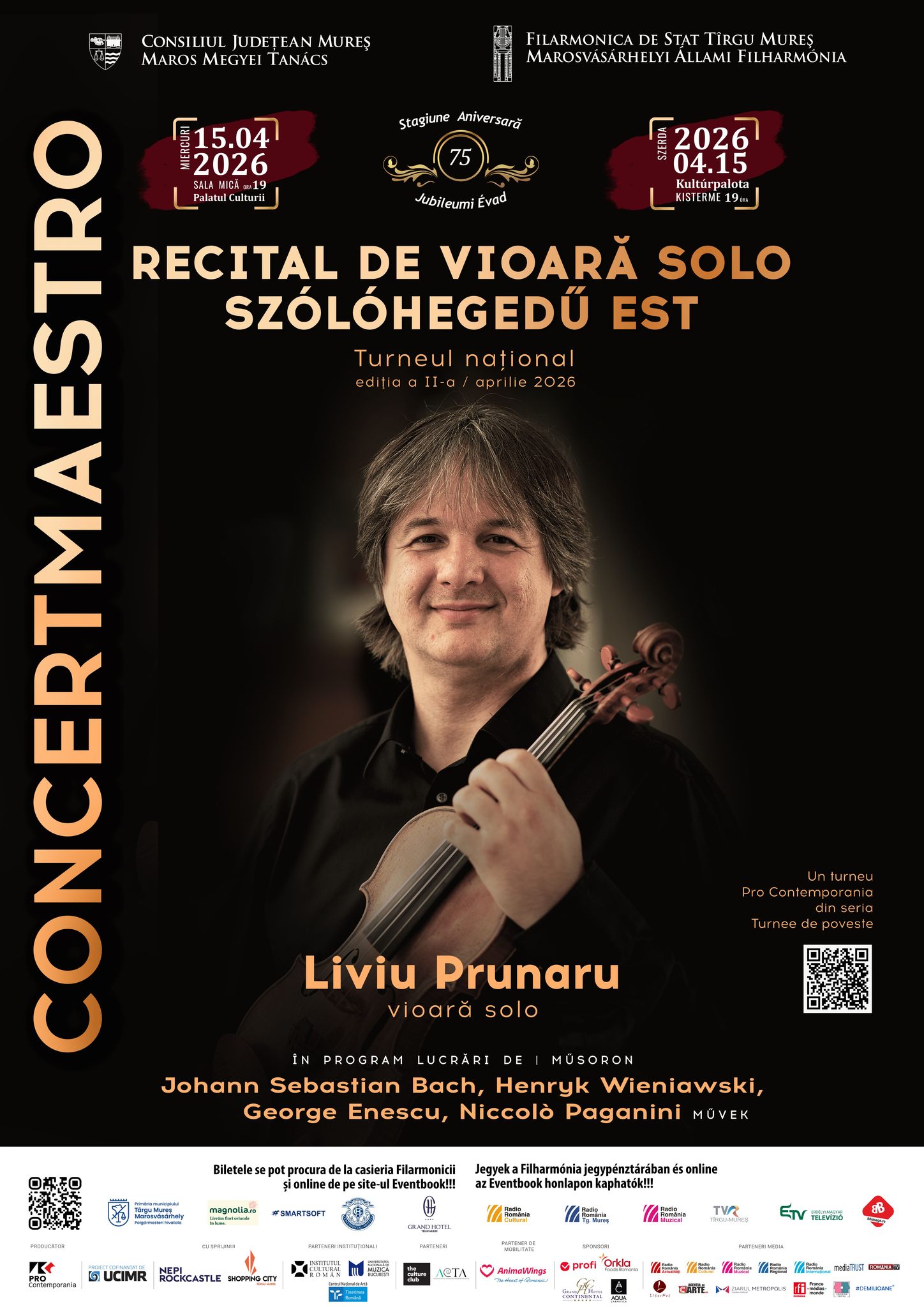 „Concertmaestro”, susținut de marele violinist Liviu Prunaru, debutează astăzi la Târgu Mureș. Recitalul are loc de la ora 19:00, la Sala mică a Palatului Culturii. Liviu Prunaru, fost concertmaestru al Orchestrei Regale Concertgebouw din Amsterdam.