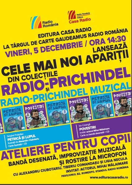 Vineri, 5 decembrie, la ora 14:30, cei mai mici cititori sunt aşteptaţi la lansarea audiobookurilor din colecţiile „Radio-Prichindel” şi „Radio-Prichindel Muzical”. Actorul Mihai Mălaimare le va prezenta cu haz Povestirile lui Ion Creangă, transpuse în bandă desenată de Alexandru Ciubotariu, cel care a ilustrat şi povestea muzicală Petrică şi lupul de Serghei Prokofiev, apărută în colecţia „Radio-Prichindel Muzical”. Trei ateliere inedite îi vor implica pe copii în activităţi creative: Alexandru Ciubotariu îi va învăţa cum se creează o bandă desenată, Tiberiu Comandaşu le va face cunoştinţă cu câteva instrumente muzicale, iar Ligia Necula îi va provoca să devină mici actori, după ce vor exersa respiraţia şi dicţia la microfon.