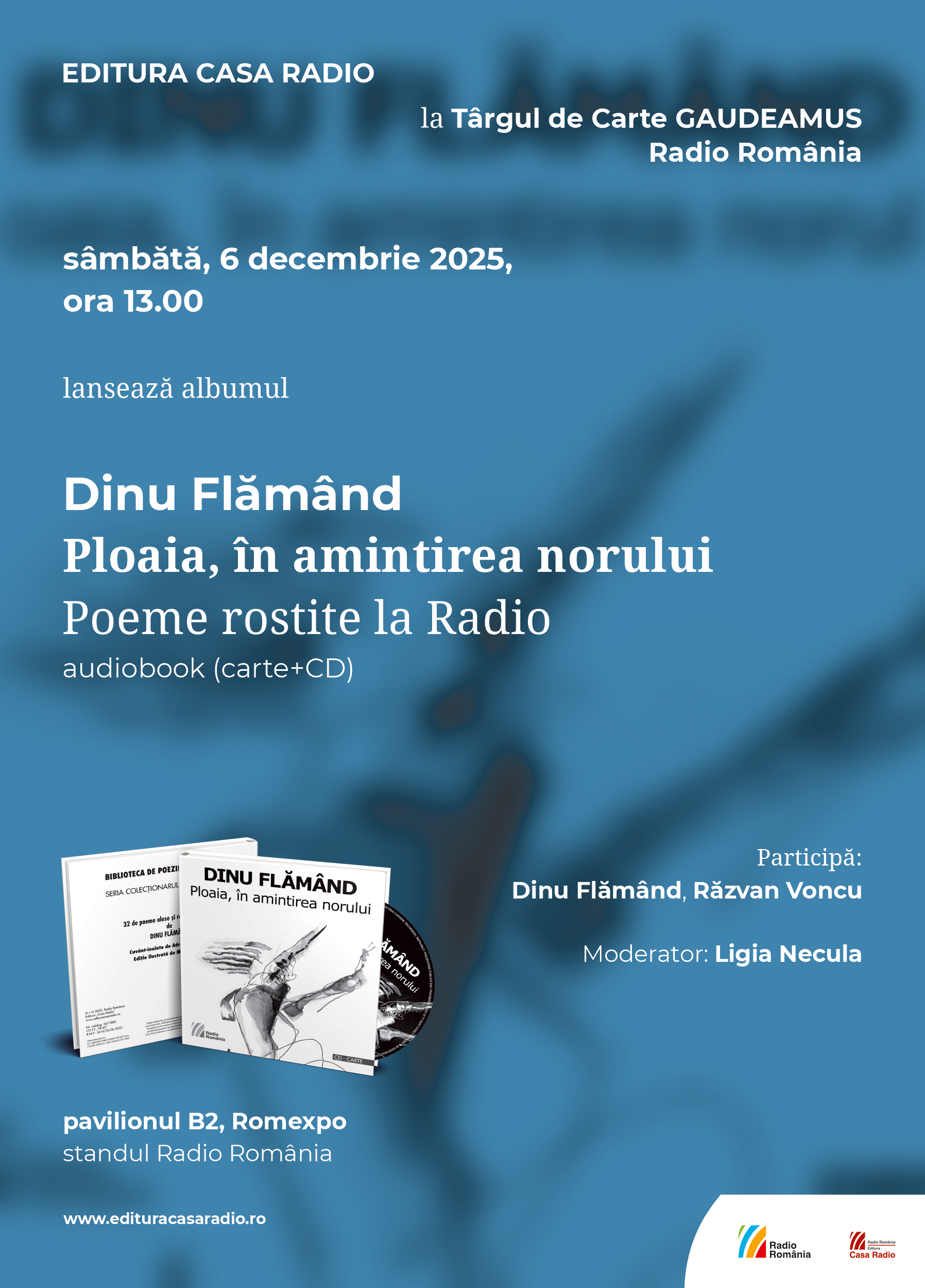 Ploaia, în amintirea norului, audiobookul din colecţia „Biblioteca de poezie românească” semnat de poetul Dinu Flămând, se va lansa la ora 13:00, în prezenţa autorului şi a criticului literar Răzvan Voncu. Dinu Flămând este creatorul „unei poezii fără vârstă în creația universală, care îl așază în proximitatea marilor nume ale literaturii lumii”, aşa cum spune Adrian Lesenciuc în prefaţa sa. 32 de poeme alese și rostite la Radio de autor se regăsesc acum pe CD-ul acestui audiobook şi sunt totodată aşezate, cu atenţia unui bibliofil, şi în cartea care păstrează ilustraţiile inspirate ale lui Marcel Lupşe. Întâlnirea va fi moderată de Ligia Necula.