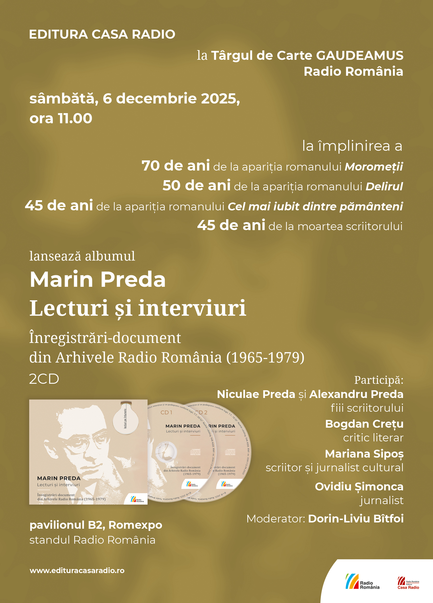 La ora 11:00, Editura Casa Radio vă invită la lansarea audiobookului (2 CD) Marin Preda, Lecturi şi interviuri. Înregistrări document din Arhivele Radio România (1965-1979). La 45 de ani de la moartea marelui scriitor, îl veţi putea asculta pe Marin Preda care citeşte, de obicei din manuscris, fragmente din romanele sale, unele ulterior cenzurate la publicare (CD 1), şi acordă interviuri la Radio România despre ideile, proiectele şi personajele sale (CD 2). Vor participa la lansare Niculae Preda şi Alexandru Preda – fiii scriitorului, criticul literar Bogdan Creţu, îngrijitorul ediţiei, scriitoarea şi jurnalista culturală Mariana Sipoş şi jurnalistul Ovidiu Şimonca. Întâlnirea va fi moderată de Dorin Bîtfoi.
