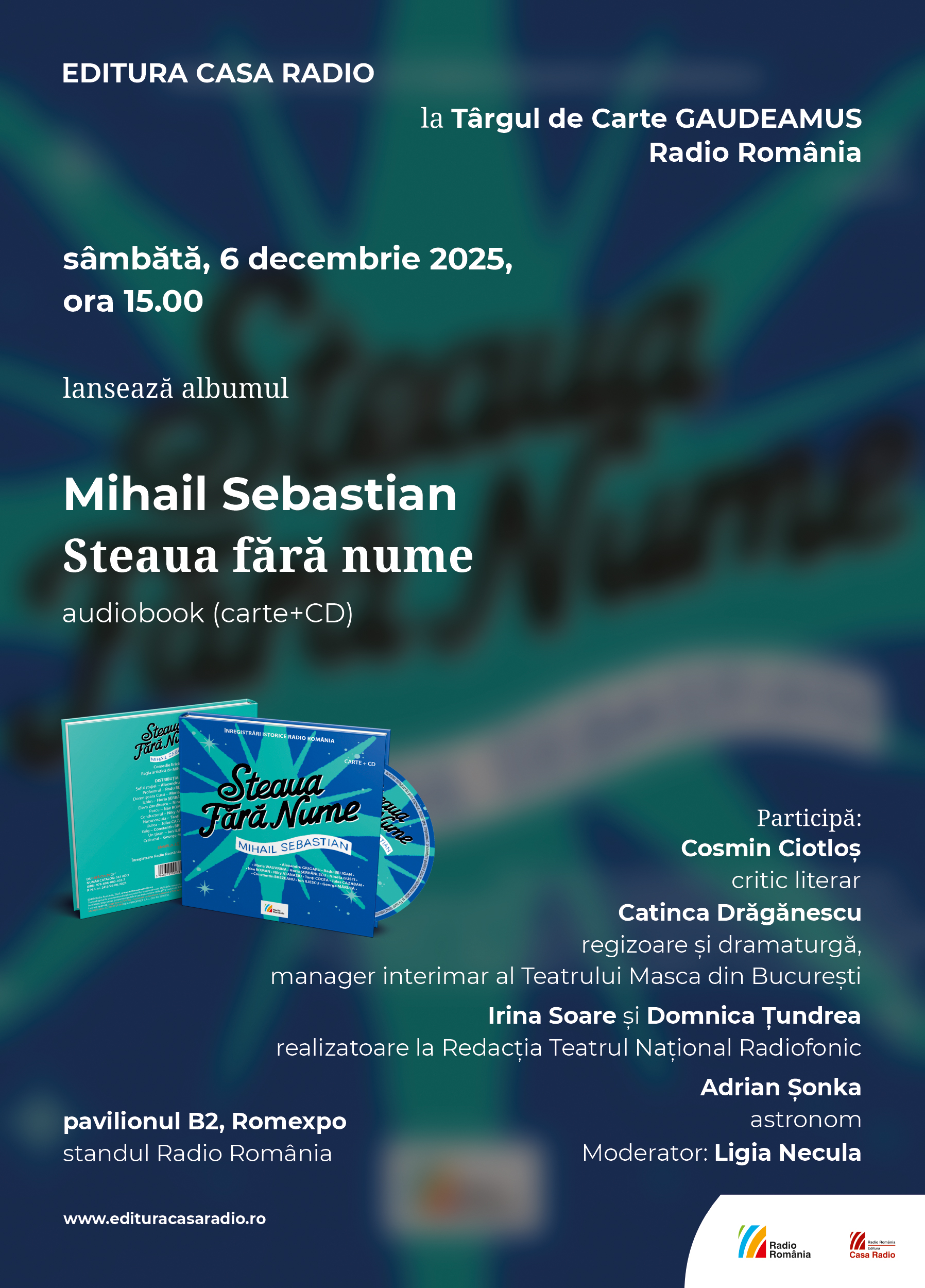 Steaua fără nume va apărea la Gaudeamus de la ora 15:00. Spectacolul de teatru radiofonic realizat în 1954 de regizorul Mihai Zirra după piesa omonimă a dramaturgului Mihail Sebastian, cu participarea unor mari nume ale teatrului românesc, se regăseşte pe cel mai recent audiobook din colecţia „Fonoteca de Aur – Teatru”. La evenimentul de lansare vor participa Catinca Drăgănescu, regizoare şi dramaturgă, manager interimar al Teatrului „Masca” din Bucureşti, Irina Soare şi Domnica Ţundrea, realizatoare la Redacţia Teatrul Naţional Radiofonic şi astronomul Adrian Şonka. Criticul literar Cosmin Ciotloş, semnatarul prefeţei, va plasa comedia cu nuanţe lirice a lui Mihail Sebastian în contextul cultural contemporan. Întâlnirea va fi moderată de Ligia Necula.