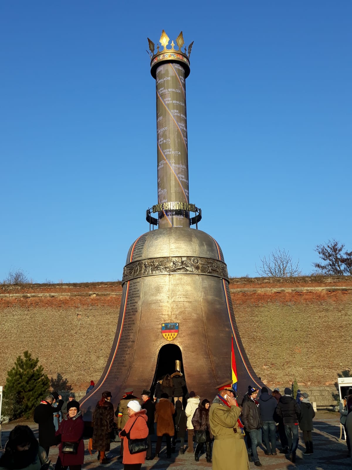 Clopotul a fost realizat de către Asociația Ofițerilor în Rezervă din România și măsoară 23 de metri, exact cât Monumentul Unirii.