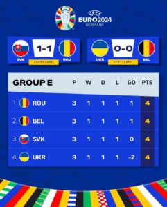 În grupa E s-a impus România, urmată de Belgia, Slovacia și Ucraina (toate cu câte 4 puncte)!!! Primele trei clasate, România, Belgia și Slovacia și-au asigurat prezența în optimile de finală.