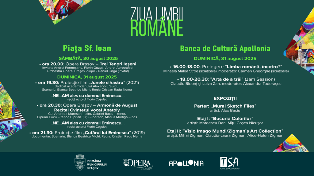 Și municipiul Brașov dedică celebrării limbii române două zile cu evenimente, ce vor avea loc sâmbătă și duminică în Piața Sf Ioan și la Centrul Cultural Apollonia, spune viceprimarul Dan Ghiță:
